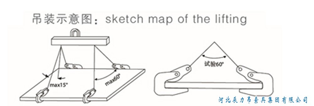 2.當采用如圖所示進行吊裝時,必須降低載荷使用,一般規(guī)定β≤45°。在β=45°時,橫吊起重鉗的起重載荷為原起重載荷的0.5倍,在β=30°時,橫吊起重鉗的起重載荷為原起重載荷為0.75倍。